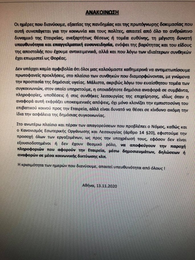 Στο ανωτέρω πλαίσιο και πέραν των απαγορεύσεων που προβλέπει ο νόμος, καθώς και ο Κανονισμός Εσωτερικής Οργάνωσης και Λειτουργίας, εφιστούμε την προσοχή όλων των εργαζομένων, ως προς την υποχρέωσή τους, εφοσον δεν είναι εξουσιοδοτημένοι, ή δεν έχουν θεσμικό ρόλο, να αποφεύγουν την παροχή πληροφοριών που αφορούν την Εταιρία, μέσω δημοσιευμάτων, δηλώσεων ή αναφορών σε μέσα κοινωνικής δικτύωσης, κλπ.
