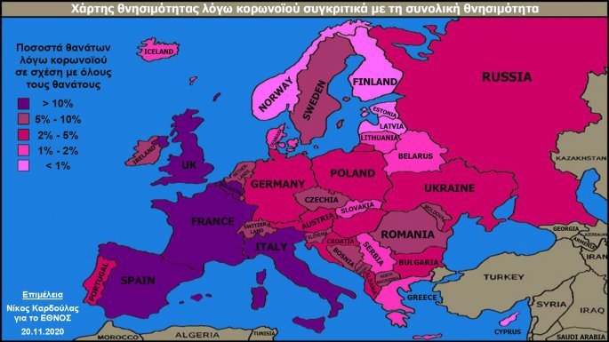 Ποσοστά από 5% έως 10% παρουσίασαν 12 χώρες, ποσοστά από 2% έως 5% παρουσίασαν 12 χώρες, ποσοστά από 1% έως 2% παρουσίασαν 8 χώρες μεταξύ των οποίων και η Ελλάδα, ενώ ποσοστά κάτω από 1% παρουσίασαν 5 χώρες με την Κύπρο να βρίσκεται στην καλύτερη θέση διεκδικώντας μία πολύ καλή πρωτιά. Η Ελλάδα βρίσκεται στην 12η θέση που θεωρείται πολύ καλή επίδοση. Από τις 21 Φεβρουαρίου μέχρι 19 Νοεμβρίου στην Ελλάδα καταγράφηκαν 88.278 θάνατοι συνολικά και οι 1.347 από αυτούς είναι από κορονοϊό.