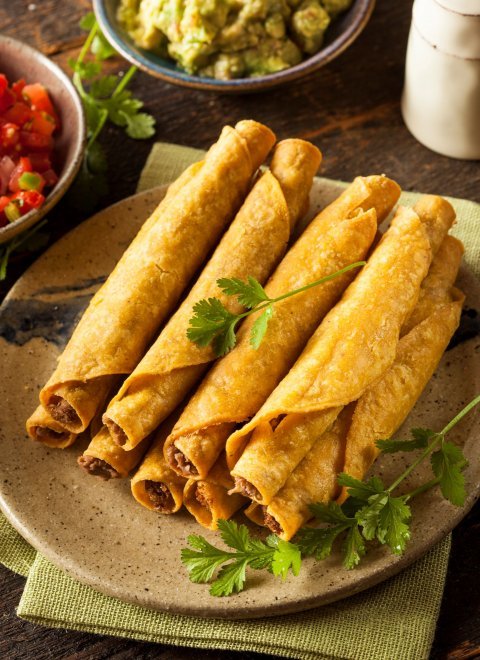 Για 6 μερίδες: 12 μεσαίες τορτίγιες, 1 δόση μαγειρεμένο πικάντικο κιμά (η συνταγή παραπάνω), 200 γρ. τριμμένο τσένταρ, λάδι για τηγάνισμα, 1 δόση φρέσκια σάλτσα ντομάτας και 1 δόση γουακαμόλε