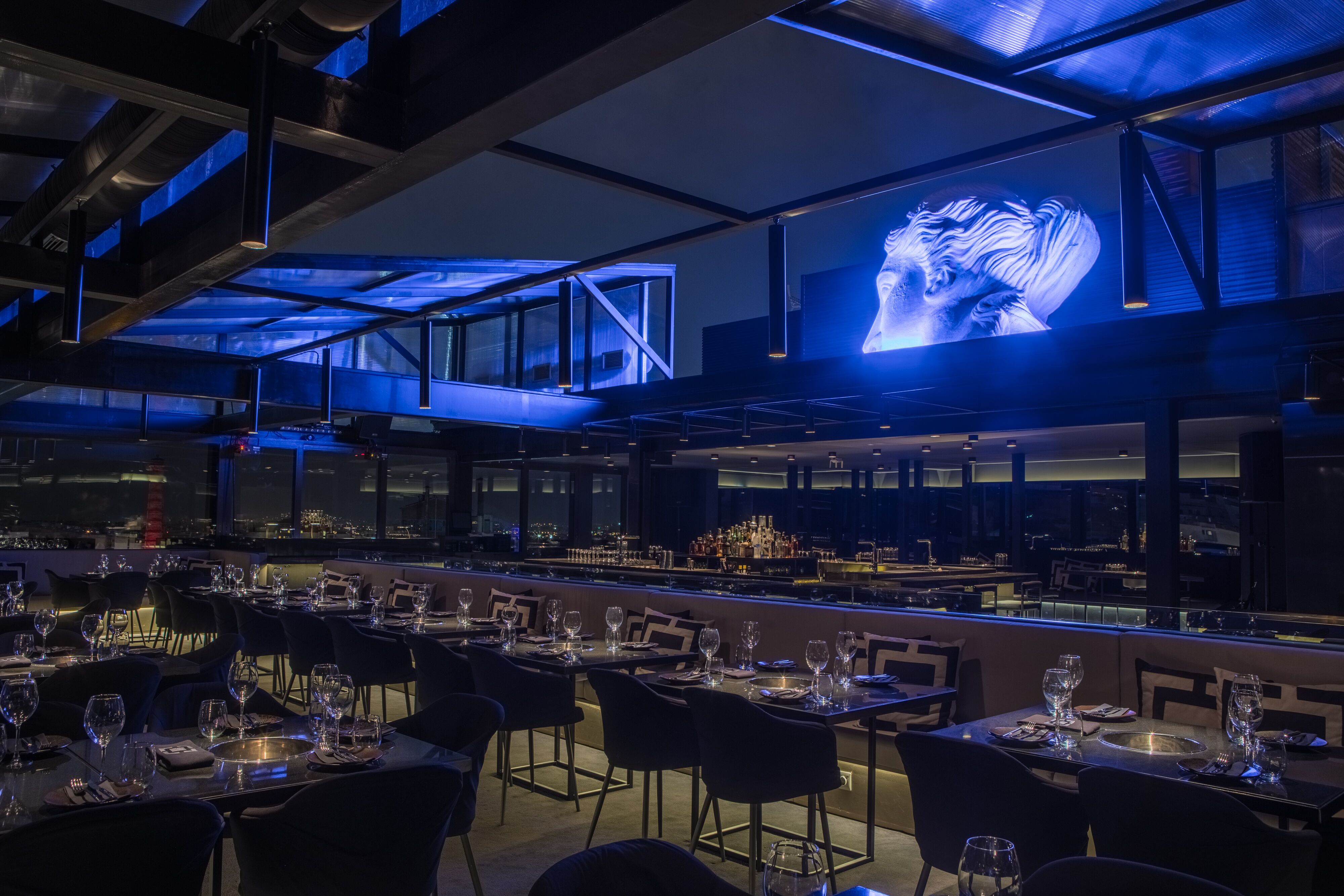 Εστιατόριο, μπαρ και κονσόλα έχουν βρει τη θέση τους στο σκοτεινά πολυτελές μαύρο-γκρι κουτί που βλέπει στην Ακρόπολη κι αντλεί έμπνευση από την κλασική αρχαιότητα. Πάνω από το μπαρ, έχει τοποθετηθεί μια εντυπωσιακή σε μέγεθος λευκή προτομή της θεάς Αθηνάς, φιλοτεχνημένη από τον γλύπτη Βασίλη Σακή. Αλλά δεν είναι μόνο αυτό.