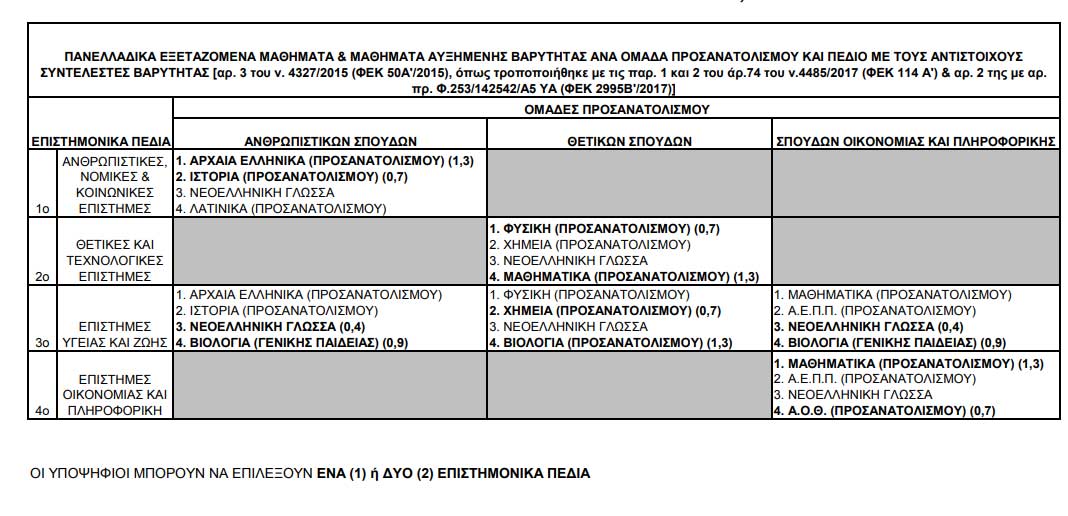Οι μαθητές εξετάζονται υποχρεωτικά στα μαθήματα της Ομάδας Προσανατολισμού που ήδη έχουν επιλέξει και παρακολουθούν ενώ οι απόφοιτοι μπορούν να επιλέξουν να εξεταστούν στα μαθήματα οποιασδήποτε Ομάδας Προσανατολισμού. Όλοι οι υποψήφιοι μπορούν να επιλέξουν έναν ή δύο από τους παρακάτω εναλλακτικούς συνδυασμούς μαθημάτων ανά Ομάδα Προσανατολισμού, λαμβάνοντας υπόψη και τα μαθήματα στα οποία υπάρχουν αυξημένοι συντελεστές βαρύτητας, όπως αυτοί καθορίστηκαν με το άρθρο 2 της αριθμ.Φ.253/142542/Α5/2017 (ΦΕΚ 2995 B’) Υπουργικής Απόφασης. Για την εισαγωγή στα τμήματα κάθε Επιστημονικού Πεδίου, θα υπολογίζονται τα τέσσερα (4) μαθήματα και οι συντελεστές βαρύτητας τα οποία προβλέπονται στην Ομάδα Προσανατολισμού όπου ανήκει ο υποψήφιος για το συγκεκριμένο Επιστημονικό Πεδίο.