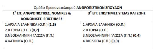 Τα κοινά μαθήματα, στα οποία εξετάζονται υποχρεωτικά οι υποψήφιοι της Ομάδας Προσανατολισμού Ανθρωπιστικών Σπουδών, σε όποιο Επιστημονικό Πεδίο και αν κατευθύνονται, είναι τα εξής τρία (3): 1. Αρχαία Ελληνικά Ομάδας Προσανατολισμού 2. Ιστορία Ομάδας Προσανατολισμού 3. Νεοελληνική Γλώσσα Γενικής Παιδείας Οι υποψήφιοι εκτός από τα ανωτέρω τρία κοινά μαθήματα θα πρέπει να εξεταστούν: α) στα Λατινικά Ομάδας Προσανατολισμού, για να έχουν πρόσβαση στο 1 ο Επιστημονικό Πεδίο β) στη Βιολογία Γενικής Παιδείας, για να έχουν πρόσβαση στο 3 ο Επιστημονικό Πεδίο Οι υποψήφιοι μπορούν να επιλέξουν ένα (1) ή δύο (2) Επιστημονικά Πεδία. Ειδικότερα, οι εναλλακτικοί συνδυασμοί πανελλαδικώς εξεταζομένων μαθημάτων της Ομάδας Προσανατολισμού Ανθρωπιστικών Σπουδών ανά Επιστημονικό Πεδίο και οι συντελεστές βαρύτητας των δύο μαθημάτων παρουσιάζονται στον παρακάτω πίνακα: