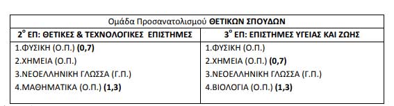 Τα κοινά μαθήματα, στα οποία εξετάζονται υποχρεωτικά οι υποψήφιοι της Ομάδας Προσανατολισμού Θετικών Σπουδών, σε όποιο Επιστημονικό Πεδίο και αν κατευθύνονται, είναι τα εξής τρία (3): 3 1. Φυσική Ομάδας Προσανατολισμού 2. Χημεία Ομάδας Προσανατολισμού 3. Νεοελληνική Γλώσσα Γενικής Παιδείας Οι υποψήφιοι εκτός από τα ανωτέρω τρία κοινά μαθήματα θα πρέπει να εξεταστούν: α) στα Μαθηματικά Ομάδας Προσανατολισμού, για να έχουν πρόσβαση στο 2 ο Επιστημονικό Πεδίο β) στη Βιολογία Ομάδας Προσανατολισμού, για να έχουν πρόσβαση στο 3 ο Επιστημονικό Πεδίο Οι υποψήφιοι μπορούν να επιλέξουν ένα (1) ή δύο (2) Επιστημονικά Πεδία. Ειδικότερα οι εναλλακτικοί συνδυασμοί πανελλαδικώς εξεταζομένων μαθημάτων της Ομάδας Προσανατολισμού Θετικών Σπουδών ανά Επιστημονικό Πεδίο και οι συντελεστές βαρύτητας των δύο μαθημάτων παρουσιάζονται στον παρακάτω πίνακα:
