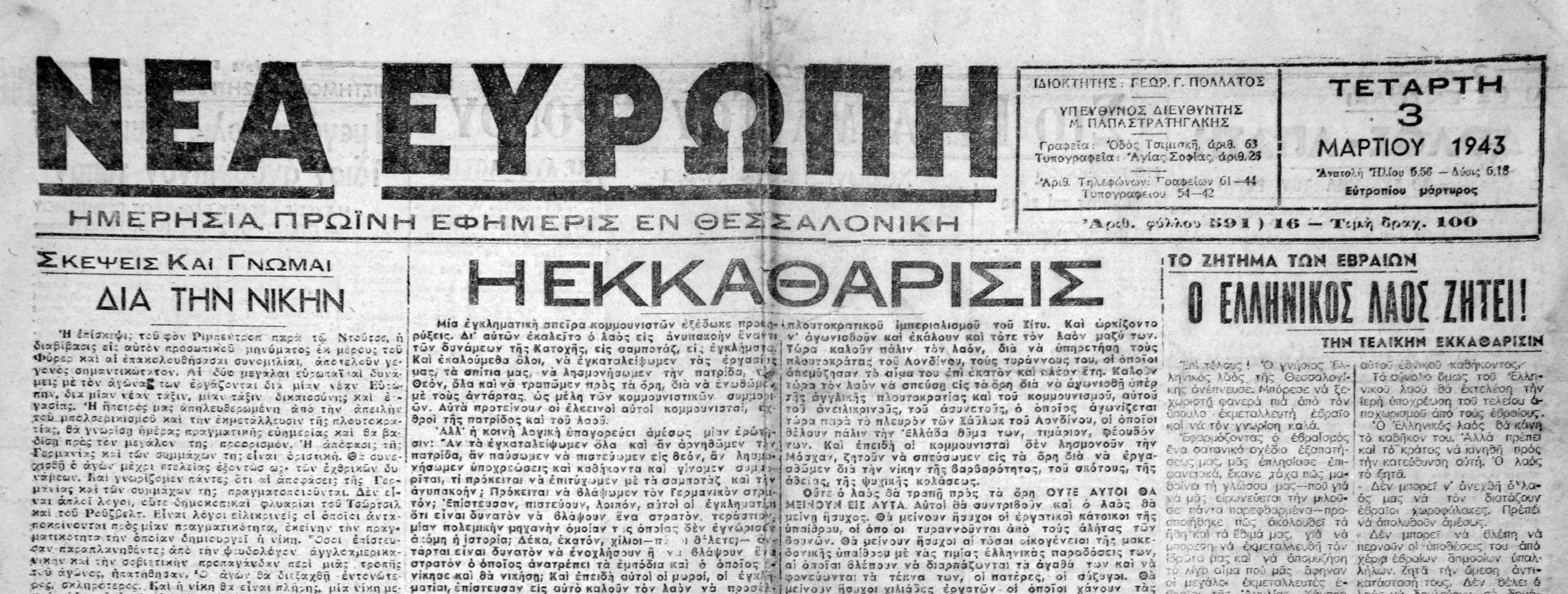 Δέκα μέρες μετά την έναρξη του εκτοπισμού των Εβραίων, στις 26 Μαρτίου 1943, το δημοτικό συμβούλιο πήρε την πρωτοβουλία να δώσει ονόματα ηρώων του 1821 στους «ορφανούς» δρόμους «αποκαθιστώντας» την… τάξη αλλά και βάζοντας μπροστά το σχέδιο… εξελληνισμού της πόλης.