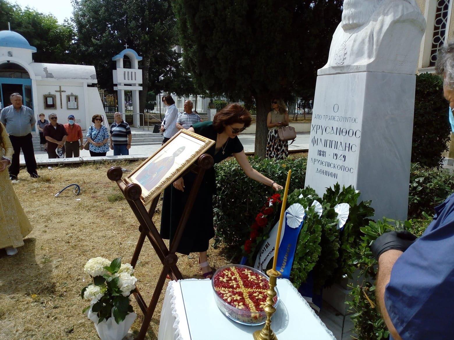 Μπροστά από την εικόνα του Αγίου και τη προτομή του Τραπεζούντιου πρώην Αρχιεπισκόπου Αθηνών, Χρύσανθου Φιλιππίδη τελέστηκε το μνημόσυνο από ιερείς της Ιεράς Μητρόπολης Νέας Κρήνης και Καλαμαριάς, παρουσία λίγου κόσμου, κυρίως εκπροσώπων της νεολαίας του συλλόγου, λόγω των περιοριστικών μέτρων για την αντιμετώπιση της εξάπλωσης του κορονοϊού.