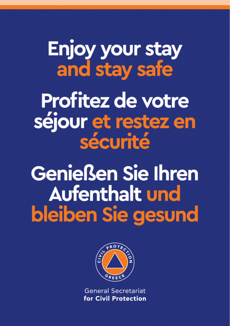 Η Γενική Γραμματεία Πολιτικής Προστασίας (ΓΓΠΠ) ήδη προχώρησε στην έκδοση 9 Οδηγιών για τα μέτρα αυτοπροστασίας από τον κορονοϊό, με κεντρικό μήνυμα: «Απολαύστε τη Διαμονή σας - Μείνετε Ασφαλείς», «Enjoy your stay and stay safe». Η καμπάνια, η οποία πραγματοποιήθηκε σε συνεργασία με τον ΕΟΔΥ, την ΥΠΑ, την Fraport και το Διεθνές Αεροδρόμιο Αθηνών «Ελευθέριος Βενιζέλος», είναι στη διάθεση του κοινού σε τρεις γλώσσες, αγγλικά, γαλλικά, γερμανικά.