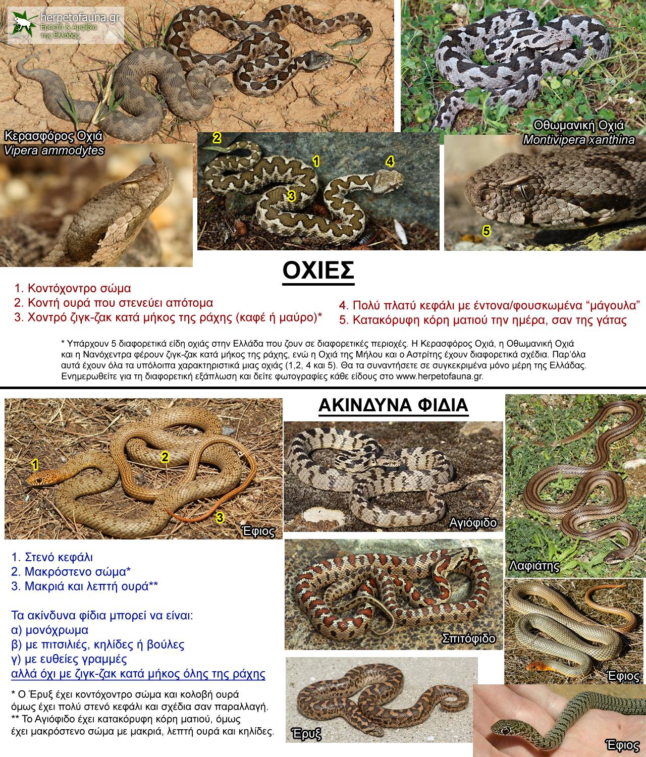 Στην Ελλάδα απαντώνται 23 διαφορετικά είδη φιδιού και 6 είδη άποδων σαυρών που μοιάζουν με φίδια. Μόνο πέντε από αυτά τα είδη έχουν επικίνδυνο δάγκωμα και είναι όλα είδη οχιάς.
