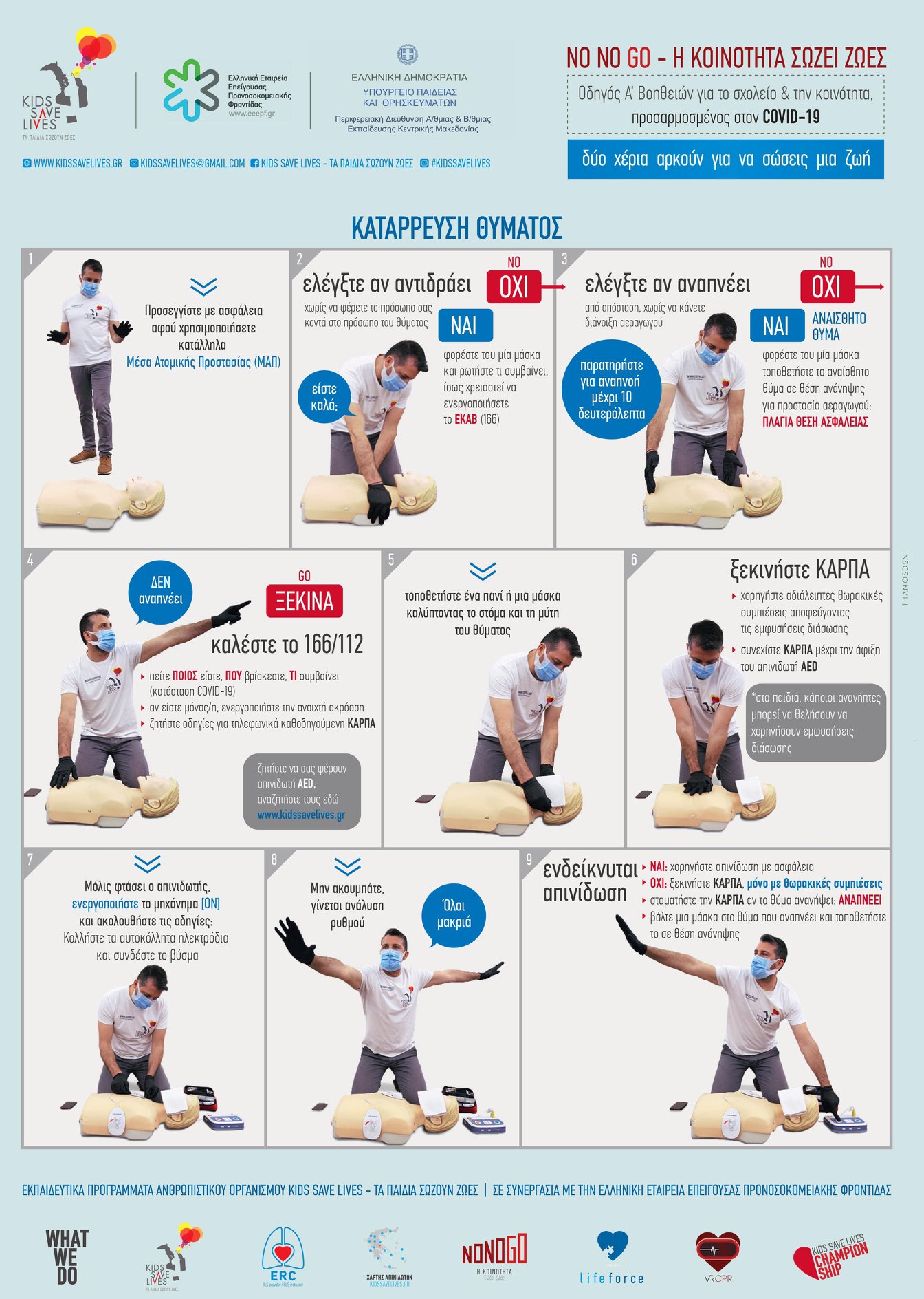 - Αν ο εθελοντής είναι τυχαία παρευρισκόμενος, η οδηγία αλλάζει: προέχει το χρέος και η ευθύνη του απέναντι στην οικογένεια και στην κοινωνία. Προσεγγίζει το θύμα έχοντας λάβει μέσα προστασίας (μάσκα, γάντια), γονατίζει δίπλα του και από απόσταση ελέγχει αν αντιδράει χωρίς να προχωρήσει σε διάνοιξη του αεραγωγού. Αν δεν αναπνέει, καλύπτει με μια μάσκα ή πανί το στόμα και τη μύτη του θύματος και προχωρά μόνο σε θωρακικές συμπιέσεις και γρήγορες απινιδώσεις αποφεύγοντας τις εμφυσήσεις.
