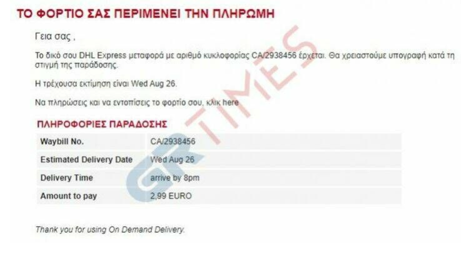 Οι χάκερ μάλιστα ζητούν από τους παραλήπτες να πατήσουν πάνω σε έναν ενεργό σύνδεσμο για να πληρώσουν και να εντοπίσουν το φορτίο τους προκειμένου να ολοκληρωθεί η διαδικασία της παραλαβής από την DHL.