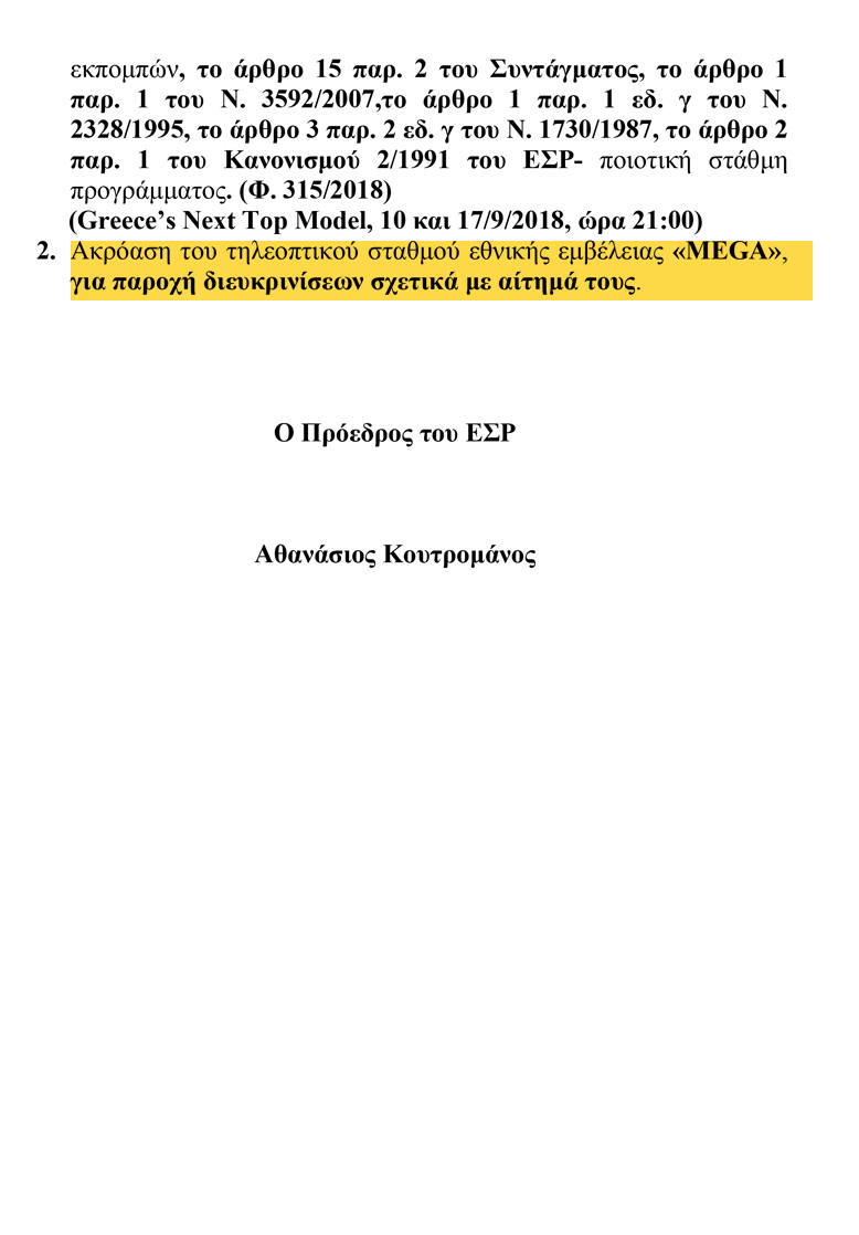 Η ακρόαση όπως αναγράφεται και στα θέματα ημερήσιας διάταξης του ΕΣΡ για την Τρίτη 30 Οκτωβρίου, είναι πράγματι με το MEGA, όμως «για διευκρινίσεις σχετικά με αίτημά τους», το οποίο δεν αφορά τη διακοπή του σήματος του καναλιού.