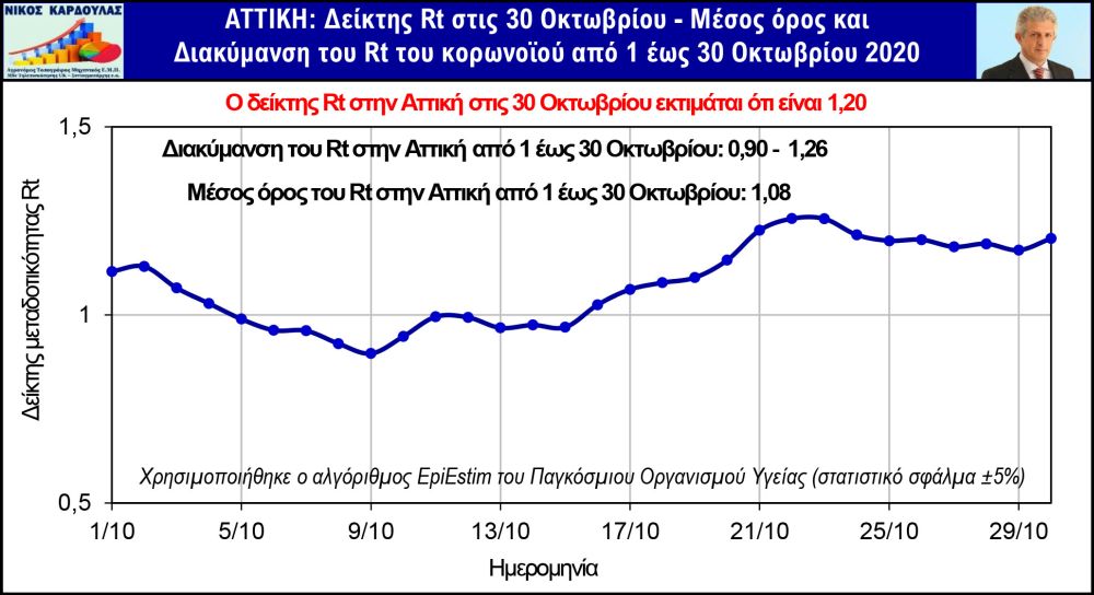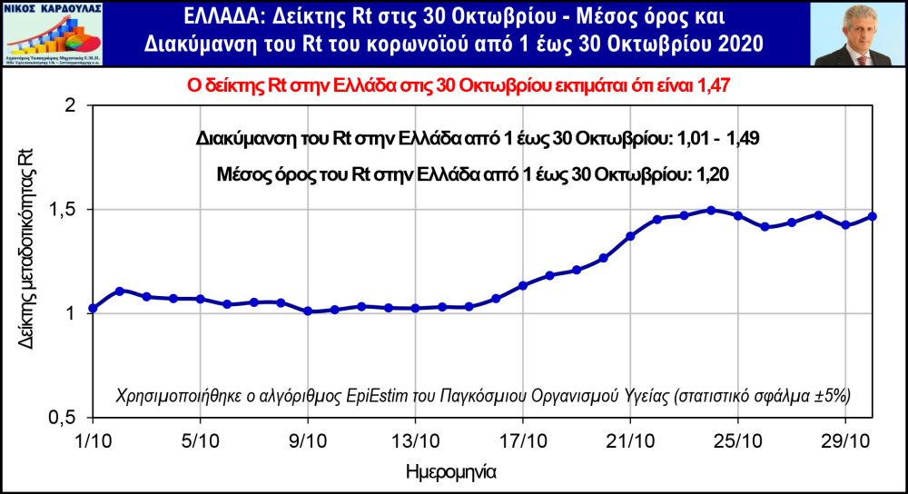 Επίσης, Rt στην Ελλάδα στις 30 Οκτωβρίου εκτοξεύθηκε στο 1,47, σχεδόν τιμή ίση με τη μέγιστη τιμή (1.48) που παρουσίασε ο Rt στο 1ο κύμα της πανδημίας. Στα παρακάτω γραφήματα απεικονίζονται η εκτίμηση του μέσου όρου του δείκτη μεταδοτικότητας Rt και η διακύμανσή του τον Οκτώβριο του 2020 και η εκτίμηση του Rt στις 30 Οκτωβρίου στην Ελλάδα, στην Αττική και στη Θεσσαλονίκη, χρησιμοποιώντας τον αλγόριθμο EpiEstim του Παγκόσμιου Οργανισμού Υγείας και επίσημα στοιχεία του ΕΟΔΥ.