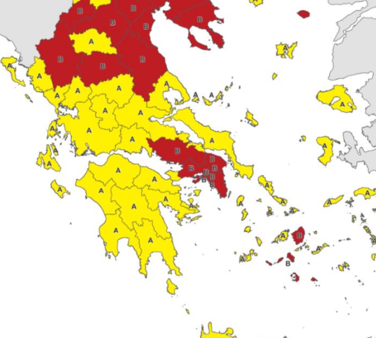 Τα τέσσερα επίπεδα στον χάρτη επικινδυνότητας συγχωνεύονται σε δύο. Τα πρώτα δύο συγχωνεύονται στο επίπεδο Α και τα δύο επόμενα συγχωνεύονται στο επίπεδο Β, δηλαδή αυξημένου κινδύνου. 47 περιοχές της χώρας εντάσσονται στο επίπεδο Α' επιτήρησης και 27 στο κόκκινο επίπεδο «αυξημένου κινδύνου».