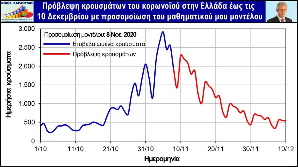 Ενσωματώνοντας στο μαθηματικό μοντέλο και τα επιβεβαιωμένα δεδομένα της περασμένης εβδομάδας, διαπιστώθηκε μετά τη σχετική προσομοίωση ότι η κορύφωση των κρουσμάτων συνέβη στις 5 Νοεμβρίου, όπου επιβεβαιώθηκαν από τον ΕΟΔΥ 2.917 κρούσματα και η πανδημία βρίσκεται πλέον σε καθοδική πορεία.
