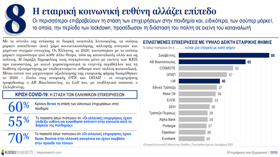 Με το σύνολο της εστίασης σε διαρκή αναστολή λειτουργίας, τα σούπερ μάρκετ αποτέλεσαν (και) χώρο κοινωνικοποίησης, κάλυψης αναγκών και χαμένων στιγμών ευτυχίας. Οι Έλληνες, το 2020, ταυτίστηκαν με το σούπερ μάρκετ περισσότερο από κάθε άλλο θεσμό, τόσο ως καταναλωτές αλλά και ως πολίτες. Η έκρηξη δημοφιλίας τους συγκρίνεται μόνο με εκείνη των ΚΕΠ προ εικοσαετίας, με κοινά χαρακτηριστικά το ευγενές περιβάλλον και τη διάθεση εξυπηρέτησης με επιδεικνυόμενο σεβασμό στον πολίτη-καταναλωτή.