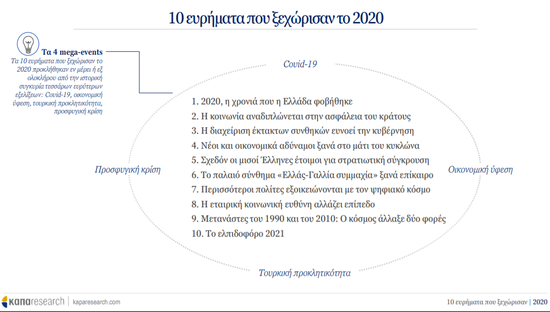 Τα 10 ευρήματα που ξεχώρισαν το 2020 προκλήθηκαν εν μέρει ή εξ ολοκλήρου από την ιστορική συγκυρία τεσσάρων ευρύτερων εξελίξεων: Covid-19, οικονομική ύφεση, τουρκική προκλητικότητα, προσφυγική κρίση.