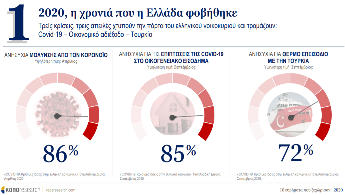 Νέα έρευνα της Kapa Research που δημοσιεύει το ethnos.gr παρουσιάζει τα 10 ευρήματα που ξεχώρισαν τη χρονιά του κορονοϊού, το 2020. Το 2020 ήταν η χρονιά που η Ελλάδα φοβήθηκε και η κοινωνία αναδιπλώθηκε στην ασφάλεια του κράτους. Σύμφωνα με τα συμπεράσματα της έρευνας, η διαχείριση έκτακτων συνθηκών ευνόησε την κυβέρνηση ενώ οι νέοι και οι οικονομικά αδύναμοι μπαίνουν ξανά στο μάτι του κυκλώνα. Μετά τη συνεχιζόμενη τουρκική προκλητικότητα, σχεδόν οι μισοί Έλληνες εμφανίζονται έτοιμοι για στρατιωτική σύγκρουση και το παλαιό σύνθημα «Ελλάς-Γαλλία συμμαχία» είναι επίκαιρο ξανά.