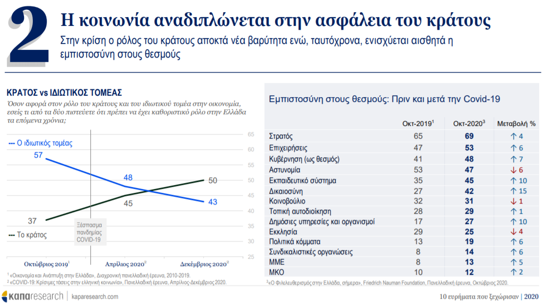Στην κρίση ο ρόλος του κράτους αποκτά νέα βαρύτητα ενώ, ταυτόχρονα, ενισχύεται αισθητά η εμπιστοσύνη στους θεσμούς. Ενδεικτικό συμπέρασμα της έρευνας είναι ότι η εμπιστοσύνη στον θεσμό της Δικαιοσύνης αυξήθηκε κατά 15 ποσοστιαίες μονάδες από τον Οκτώβρη του 2019 (27%) στον Οκτώβρη του 2020 (42%)