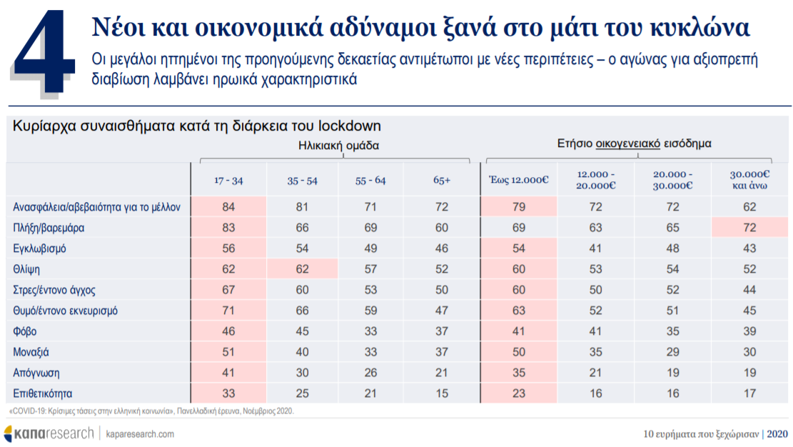 Οι μεγάλοι ηττημένοι της προηγούμενης δεκαετίας, οι νέοι, βρίσκονται αντιμέτωποι με νέες περιπέτειες και ο αγώνας για αξιοπρεπή διαβίωση λαμβάνει ηρωικά χαρακτηριστικά. Ενδεικτικό είναι ότι κατά τη διάρκεια του lockdown για τον περιορισμό της διασποράς του κορονοϊού, το αίσθημα της ανασφάλειας και της αβεβαιότητας για το μέλλον είναι πιο ισχυρό στην ηλικιακή ομάδα 17-34.