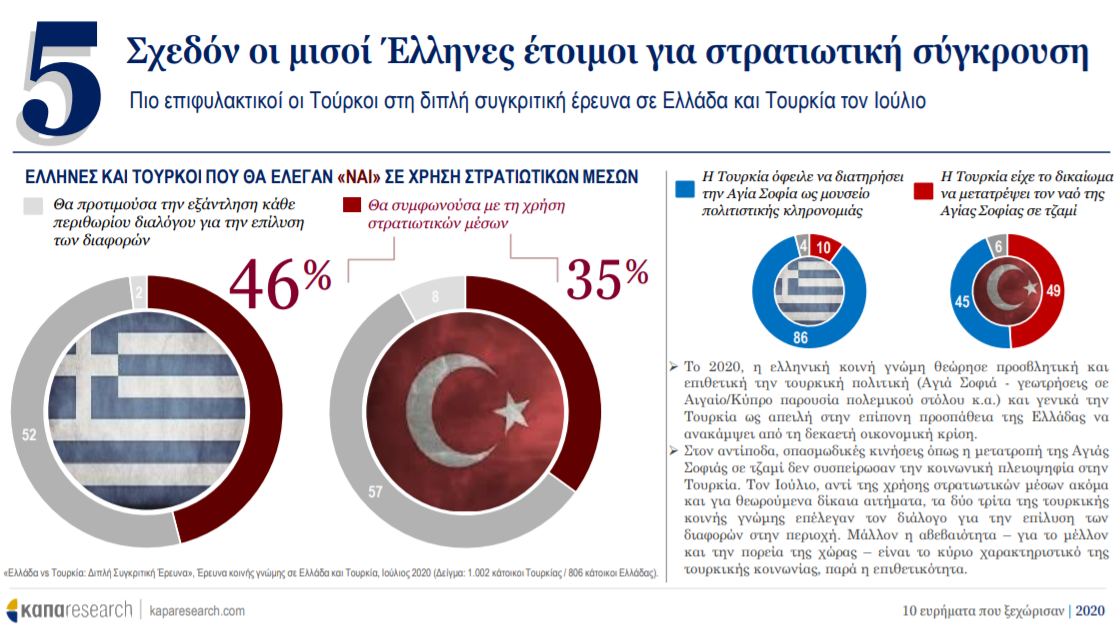 Το 2020, η ελληνική κοινή γνώμη θεώρησε προσβλητική και επιθετική την τουρκική πολιτική (Αγιά Σοφιά - γεωτρήσεις σε Αιγαίο/Κύπρο παρουσία πολεμικού στόλου κ.α.) και γενικά την Τουρκία ως απειλή στην επίπονη προσπάθεια της Ελλάδας να ανακάμψει από τη δεκαετή οικονομική κρίση.
