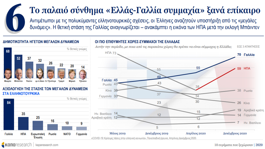 Αντιμέτωποι με τις πολυκύμαντες ελληνοτουρκικές σχέσεις, οι Έλληνες αναζητούν υποστήριξη από τις «μεγάλες δυνάμεις». Η θετική στάση της Γαλλίας αναγνωρίζεται, ενώ μετά τις αμερικανικές εκλογές και την άνοδο του Τζο Μπάιντεν ανακάμπτει η εικόνα των ΗΠΑ .