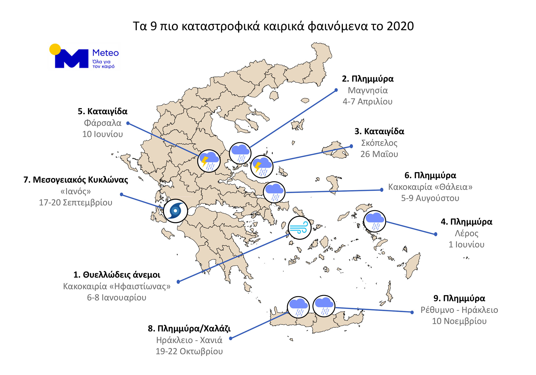 Δείτε παρακάτω τον χάρτη και την περιγραφή των 9 σοβαρότερων καιρικών γεγονότων του 2020.