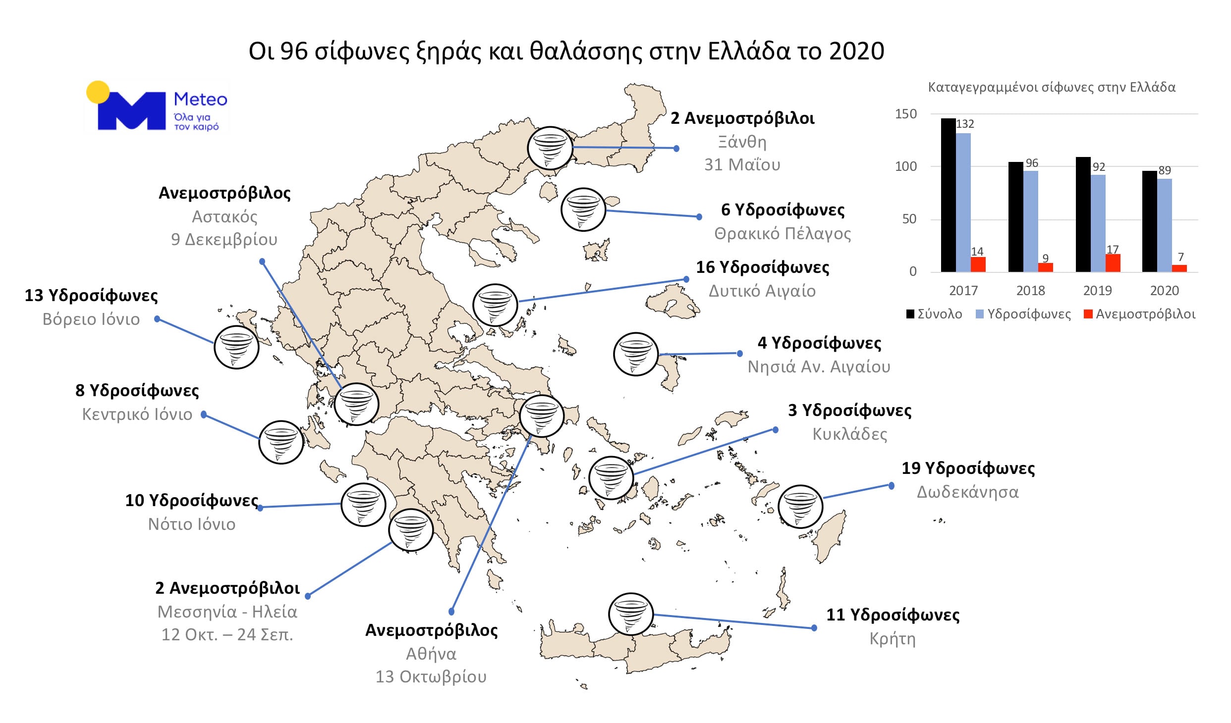 Ο παρακάτω χάρτης δείχνει τις περιοχές όπου καταγράφηκαν οι 96 σίφωνες το 2020, καθώς και τον αριθμό των αντίστοιχων καταγραφών τα τελευταία 4 χρόνια.