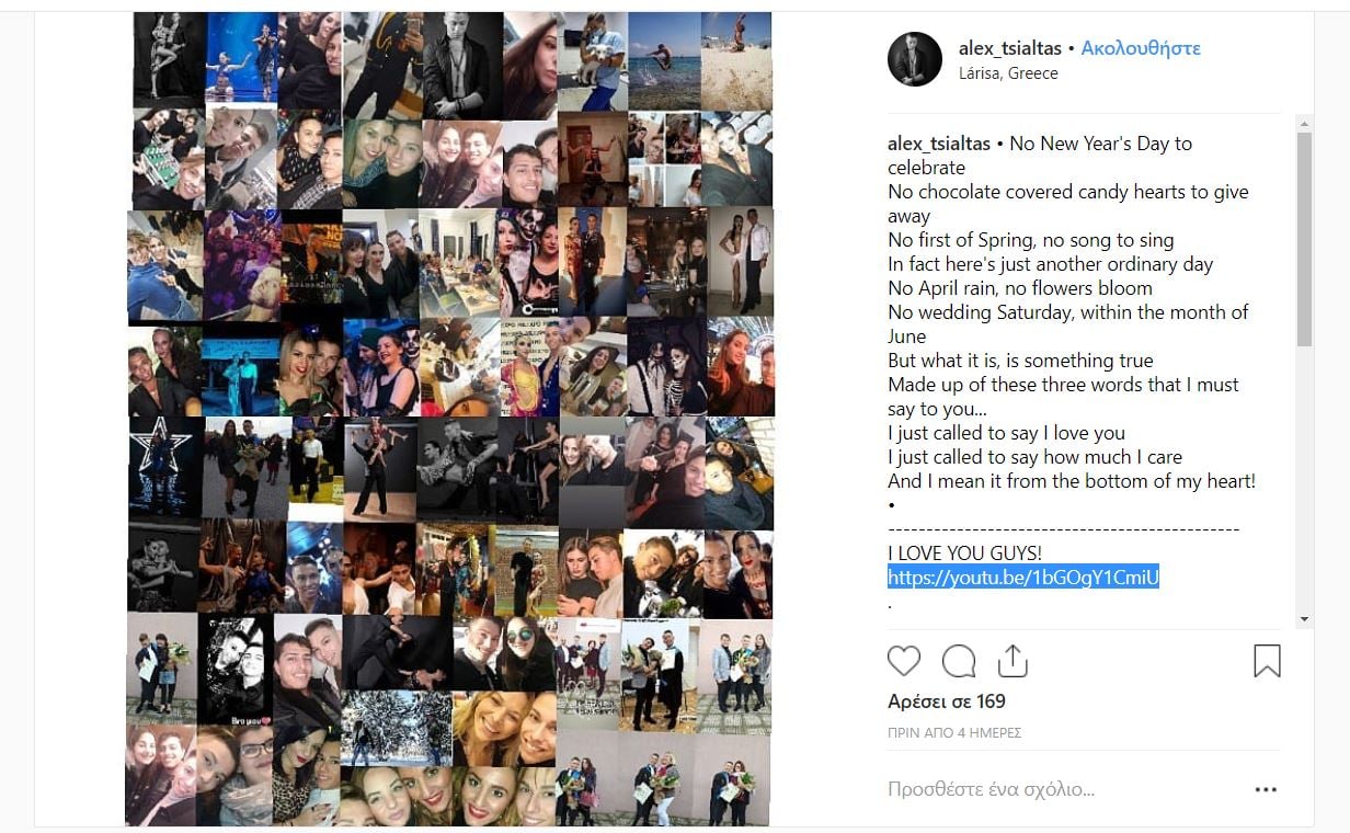 Στο προφίλ του στο Instagram έκανε μια ανάρτηση με πολλές φωτογραφίες από τον χρόνο που πέρασε, και σχολίασε γράφοντας τα λόγια από το γνωστό κομμάτι του Στίβι Γουόντερ «I just called to say I love you»... Αυτό το φωτογραφικό άλμπουμ στιγμών είναι το τελευταίο του post.