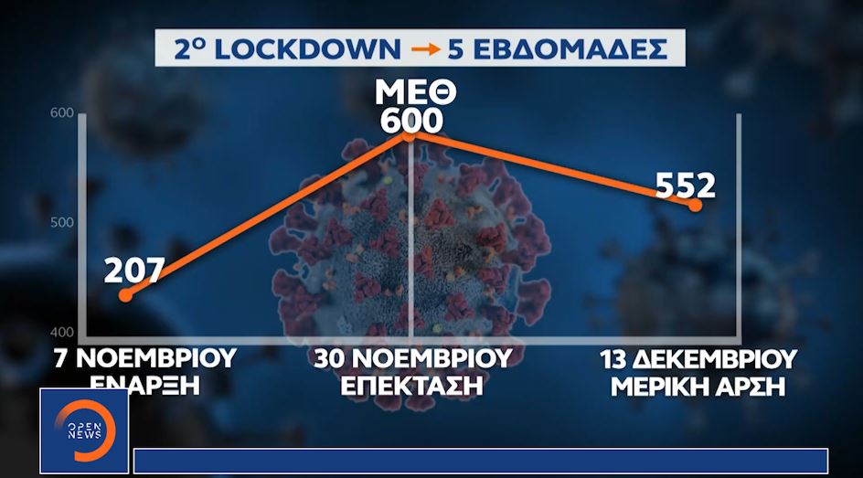 Σύμφωνα με το δεύτερο γράφημα που παρουσίασε το OPEN TV, κατά τη διάρκεια του δεύτερου lockdown τον Νοέμβριο, η καραντίνα κράτησε τελικά 5 εβδομάδες. Τα στοιχεία ήταν τα εξής: