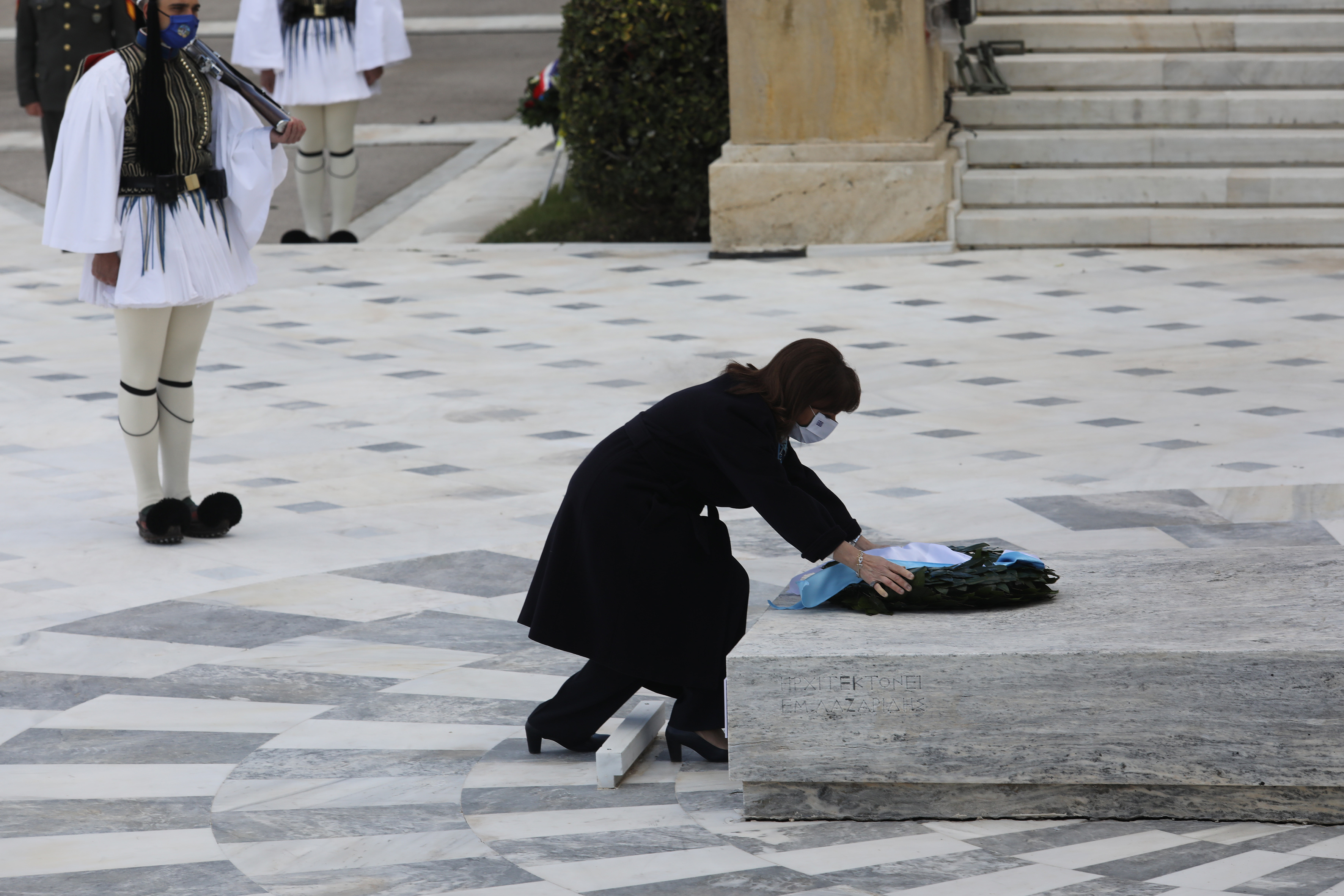 Επειτα, στεφάνι κατέθεσε ο πρωθυπουργός της Ρωσίας Μιχαήλ Μισούστιν και τέλος η Γαλλίδα υπουργός Αμυνας Φλοράνς Παρλί. Στην τελετή κατάθεσης στεφάνων παρέστησαν επίσης, ο Πρωθυπουργός, Κυριάκος Μητσοτάκης, ο αρχηγός της Αξιωματικής Αντιπολίτευσης, Αλέξης Τσίπρας, ο Πρόεδρος Βουλής, Κωνσταντίνος Τασούλας, ο Υπουργός Εξωτερικών, Νίκος Δένδιας, ο Υπουργός Εθνικής 'Αμυνας, Νίκος Παναγιωτόπουλος, ο Αρχηγός ΓΕΕΘΑ Στρατηγός Κωνσταντίνος Φλώρος, καθώς και η Πρόεδρος της Επιτροπής «Ελλάδα 2021» Γιάννα Αγγελοπούλου.