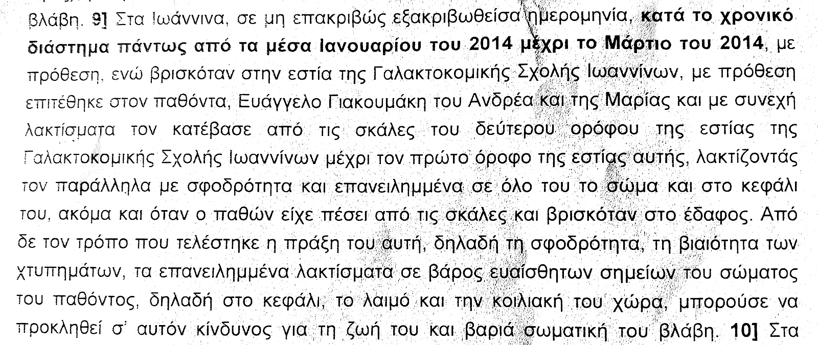 Τον Νοέµβριο του 2014, δύο από τους κατηγορουµένους φέρονται ότι τύλιξαν πολλές φορές µε κολλητική ταινία το κεφάλι του Βαγγέλη Γιακουµάκη και τον χτύπησαν στην περιοχή των γεννητικών του οργάνων, ενώ τον µήνα Ιανουάριο του ίδιου έτους, τέσσερις συγκατηγορούµενοι φέρονται ότι έριξαν τον 20χρονο στο κρεβάτι του και έπεσαν πάνω του χτυπώντας τον παράλληλα σε όλο το σώµα, προξενώντας έτσι σε αυτόν µώλωπες και παροδική ασφυξία. Εξι από τους κατηγορουµένους, ενώ βρίσκονταν στη Γαλακτοκοµική Σχολή Ιωαννίνων, τον ωθούσαν βίαια και «τον χτυπούσαν αιφνιδιαστικά και µε σφοδρότητα στον αυχένα, τον τράχηλο και το πρόσωπό του».