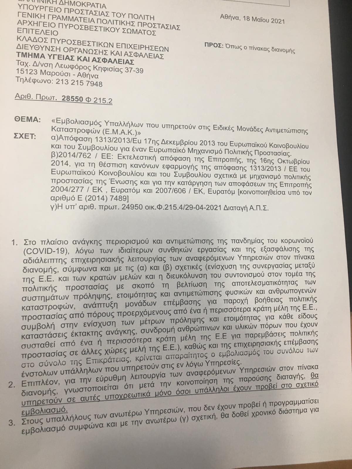 Η διαταγή του αρχηγείου του Πυροσβεστικού Σώματος αφορά στον υποχρεωτικό εμβολιασμό όλων όσοι υπηρετούν στις Ειδικές Μονάδες Αντιμετώπισης Καταστροφών, την ευρέως γνωστή ως ΕΜΑΚ, οι οποίοι αν δεν εμβολιαστούν, θα μετατεθούν σε άλλες υπηρεσίες. Η διαταγή του αρχηγείου της Πυροσβεστικής ορίζει ότι στο εξής στην ΕΜΑΚ θα υπηρετούν υποχρεωτικά μόνο όσοι έχουν προβεί στο σχετικό εμβολιασμό.