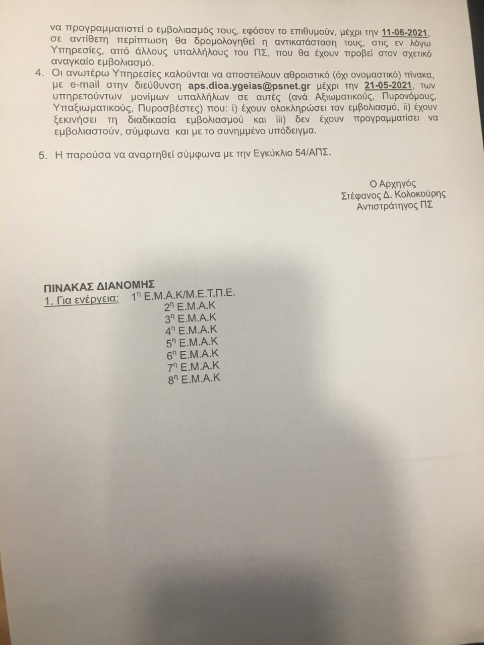 Σε αντίθετη περίπτωση θα δρομολογηθεί η αντικατάσταση τους στις εν λόγω υπηρεσίες από άλλου υπάλληλους του ΠΣ που θα έχουν εμβολιαστεί .Με απλά λόγια όσοι δεν εμβολιάζονται θα απομακρύνονται από την ΕΜΑΚ και θα αντικαθίστανται.