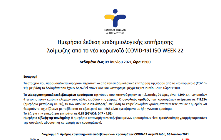 Ο συνολικός αριθμός των κρουσμάτων ανέρχεται σε 412.420 (ημερήσια μεταβολή +0.2%), εκ των οποίων 51.2% άνδρες. 1 Με βάση τα επιβεβαιωμένα κρούσματα των τελευταίων 7 ημερών, 39 θεωρούνται σχετιζόμενα με ταξίδι από το εξωτερικό και 1.604 είναι σχετιζόμενα με ήδη γνωστό κρούσμα.