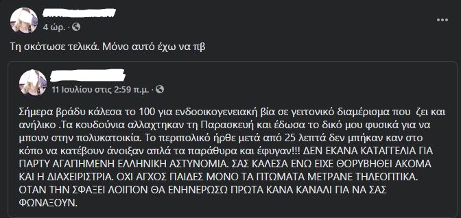 «Σήμερα βράδυ κάλεσα το 100 για ενδοοικογενειακή βία σε γειτονικό διαμέρισμα που ζει και ανήλικο.Τα κουδούνια αλλάχτηκαν την Παρασκευή και έδωσα το δικό μου φυσικά για να μπουν στην πολυκατοικία. Το περιπολικό ήρθε μετά από 25 λεπτά δεν μπήκαν καν στο κόπο να κατέβουν άνοιξαν απλά τα παράθυρα και έφυγαν! Δεν έκανα καταγγελία για πάρτι αγαπημένη ελληνική αστυνομία. Σας κάλεσα ενώ είχε θορυβηθεί ακόμα και η διαχειρίστρια. Όχι, άγχος παίδες μονό τα πτώματα μετράνε τηλεοπτικά. Όταν τη σφάξει λοιπόν, θα ενημερώσω πρώτα κανένα κανάλι για να σας φωνάξουν».