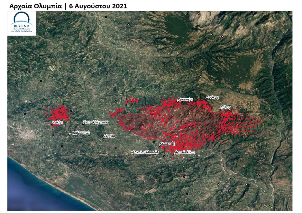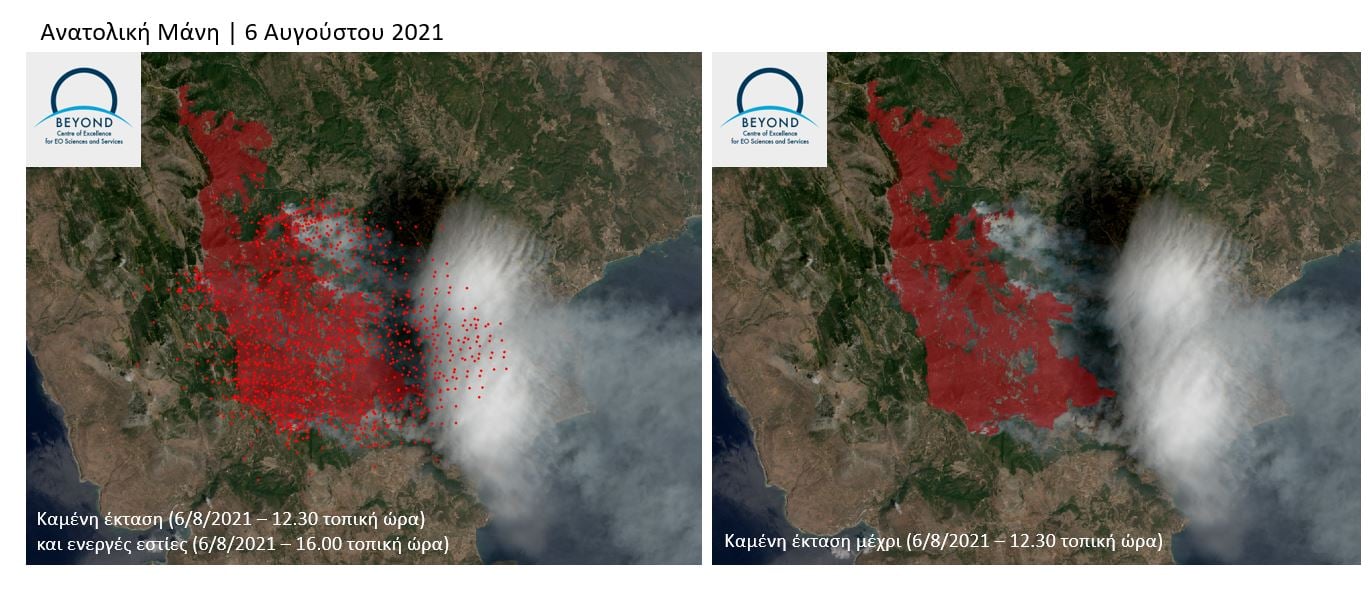 Μέχρι την ώρα λήψης των εικόνων, οι καμένες εκτάσεις υπολογίζονται σε 4.585 εκτάρια στην Ανατολική Μάνη και 6.770 εκτάρια στην Αρχαία Ολυμπία. Στις εικόνες εμφανίζονται οι σημερινές ενεργές εστίες (6/8/2021 μέχρι 16.00 τοπική ώρα). Οι πυρκαγιές βρίσκονται ακόμη σε εξέλιξη και νέα χαρτογράφηση θα πραγματοποιηθεί με το πέρασμα επόμενης εικόνας υψηλής ανάλυσης.