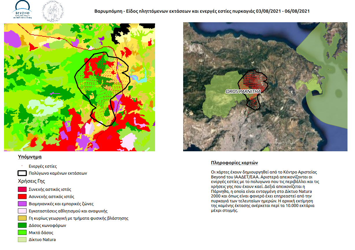 Για την Βαρυμπόμπη ακολουθούν 2 χάρτες. Αριστερά απεικονίζονται οι ενεργές εστίες πυρκαγιάς που έχουν εντοπιστεί από τους δορυφόρους (σύστημα FFIS) στις 3/8 έως σήμερα (6/8 μέχρι 16.00 τοπική ώρα) σε συνδυασμό με τις χρήσεις γης που έχουν παραδοθεί στις φλόγες. Δεξιά απεικονίζεται η Πάρνηθα, η οποία είναι ενταγμένη στο Δίκτυο Natura 2000 και όπως είναι φανερό έχει επηρεαστεί από την πυρκαγιά των τελευταίων ημερών.