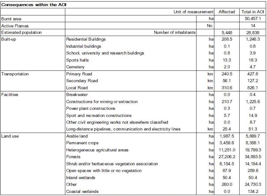 Σύμφωνα με τα στοιχεία που παραθέτει η υπηρεσία Copernicus, συνολικά η περιοχή που έχει καεί από τις φωτιές αντιστοιχεί σε 50.456,1 εκτάρια (ένα εκτάριο ισούται με 10 στρέματα επομένως η καμμένη έκταση αντιστοιχεί σε 504.561 στρέματα) ενώ αυτή τη στιγμή τα ενεργά πύρινα μέτωπα είναι 14. Ο πληθυσμός στην περιοχή ενδιαφέροντος αντιστοιχεί σε 28.838 κατοίκους, από τους οποίους περίπου 5,448 έχουν επηρεαστεί.