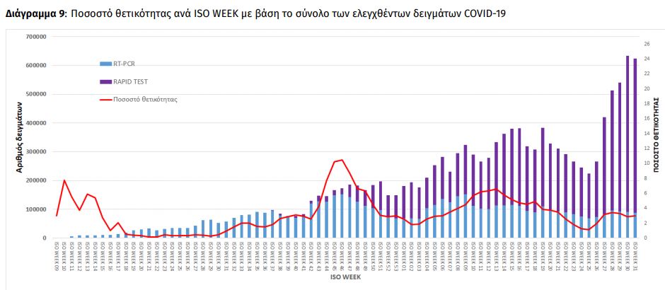 Όπως σημειώνεται «την εβδομάδα 02 Αυγούστου 2021 - 08 Αυγούστου 2021 (2021-W31) το ποσοστό θετικότητας ήταν 3.05% σε σύνολο 623.985 εργαστηριακών ελέγχων (RT-PCR/Rapid-Ag) και 0.79% σε σύνολο 709.364 αυτοδιαγνωστικών ελέγχων. Στο σύνολο των ελέγχων, το ποσοστό θετικότητας ήταν 1.47%».