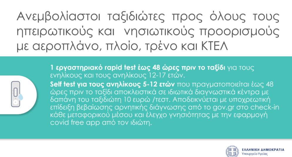 - Self test για τους ανήλικους 5-12 ετών που πραγματοποιείται έως και 48 ώρες πριν το ταξίδι αποκλειστικά σε ιδιωτικά διαγνωστικά κέντρα, με έξοδα του ταξιδιώτη 10 ευρώ ανά τεστ. Αυτό αποδεικνύεται με υποχρεωτική βεβαίωση αρνητικής διάγνωσης από το gov.gr στο check in κάθε μεταφορικού μέσου και έλεγχο γνησιότητας με την εφαρμογή covid free app από τον ιδιώτη.