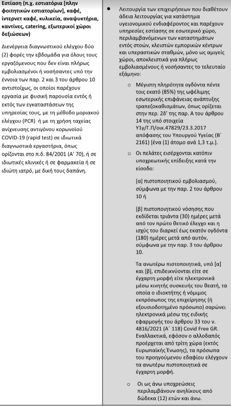 Ειδική αναφορά γίνεται στα παιδιά από 5 έως 11 ετών τα οποία μπορούν να μπουν σε κλειστούς χώρους εστίασης με δήλωση αρνητικού self test τελευταίου 24ώρου, στην οποία θα προβαίνει γονέας ή κηδεμόνας.