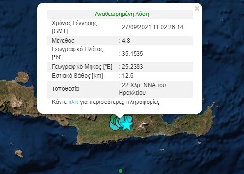 Νωρίς το μεσημέρι της Δευτέρας σημειώθηκε ακόμη ένας ισχυρός μετασεισμός μεγέθους 4,8 Ρίχτερ. Σύμφωνα με τα πρώτα στοιχεία η σεισμική δόνηση είχε επίκεντρο 22 χιλιόμετρα Νότια – Νοτιοανατολικά του Ηρακλείου και εστιακό βάθος 12,6 χιλιομέτρων.