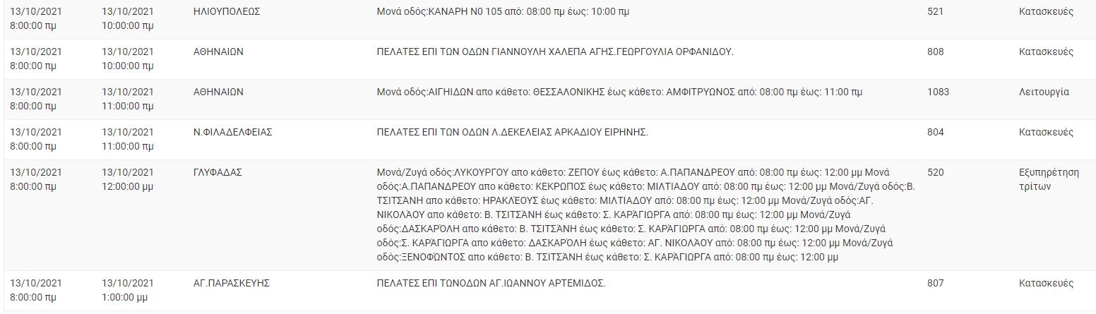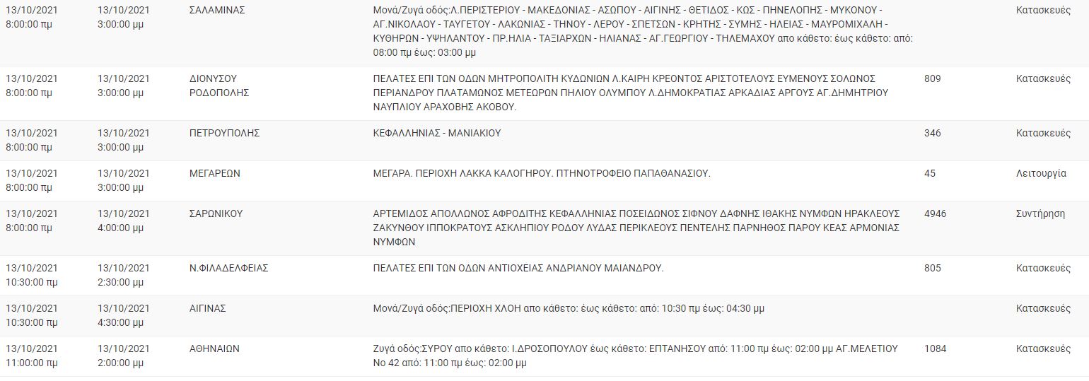 Αναλυτικά οι πίνακες με τις περιοχές της Αττικής και τις ώρες που θα σημειωθεί διακοπή ρεύματος: