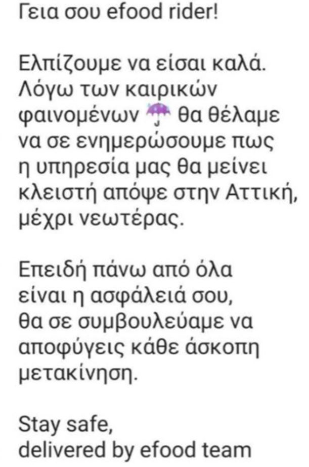 Με ειδοποίηση τόσο στους διανομείς όσο και τους καταναλωτές, η efood ενημερώνει ότι «λόγω κακοκαιρίας η υπηρεσία delivered by efood είναι κλειστή και οι διανομείς μας θα παραμείνουν εκτός δρόμου μέχρι νεοτέρας»