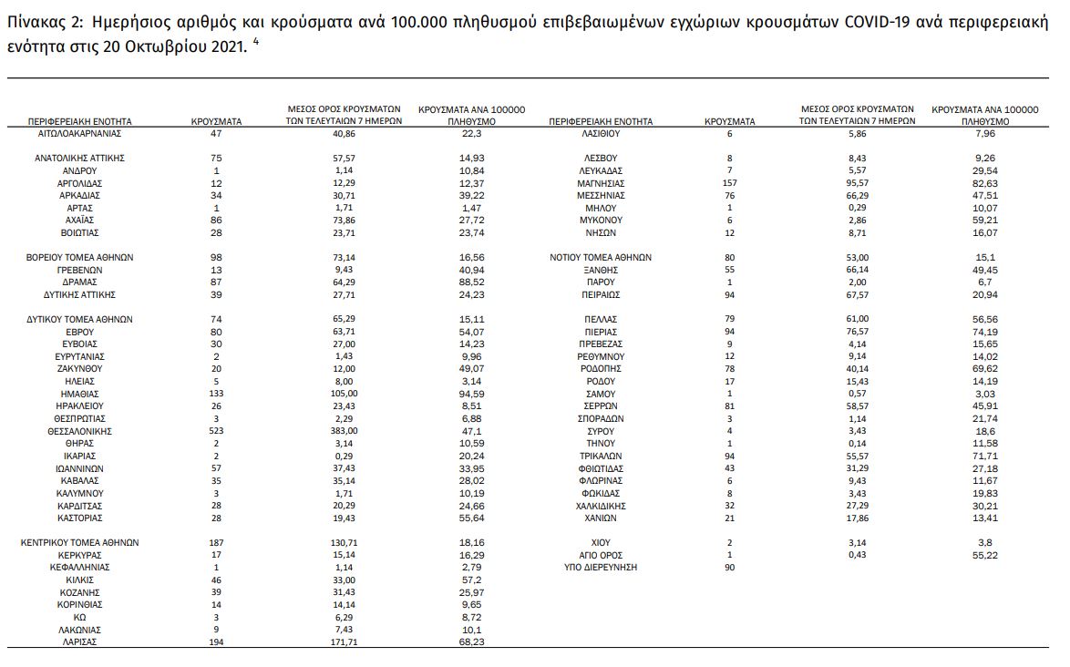 Πρώτη η Αττική στην κατανομή των κρουσμάτων κορονοϊού καθώς εντοπίστηκαν 659 κρούσματα εκ των οποίων τα 75 είναι στην Ανατολική Αττική, τα 98 στον Βόρειο Τομέα Αθηνών, τα 74 στον Δυτικό Τομέα Αθηνών, τα 187 στο Κέντρο της Αθήνας και άλλα 80 στο Νότιο Τομέα. Στη Θεσσαλονίκη εντοπίστηκαν 523 νέες μολύνσεις κορονοϊού και στη Λάρισα 194.