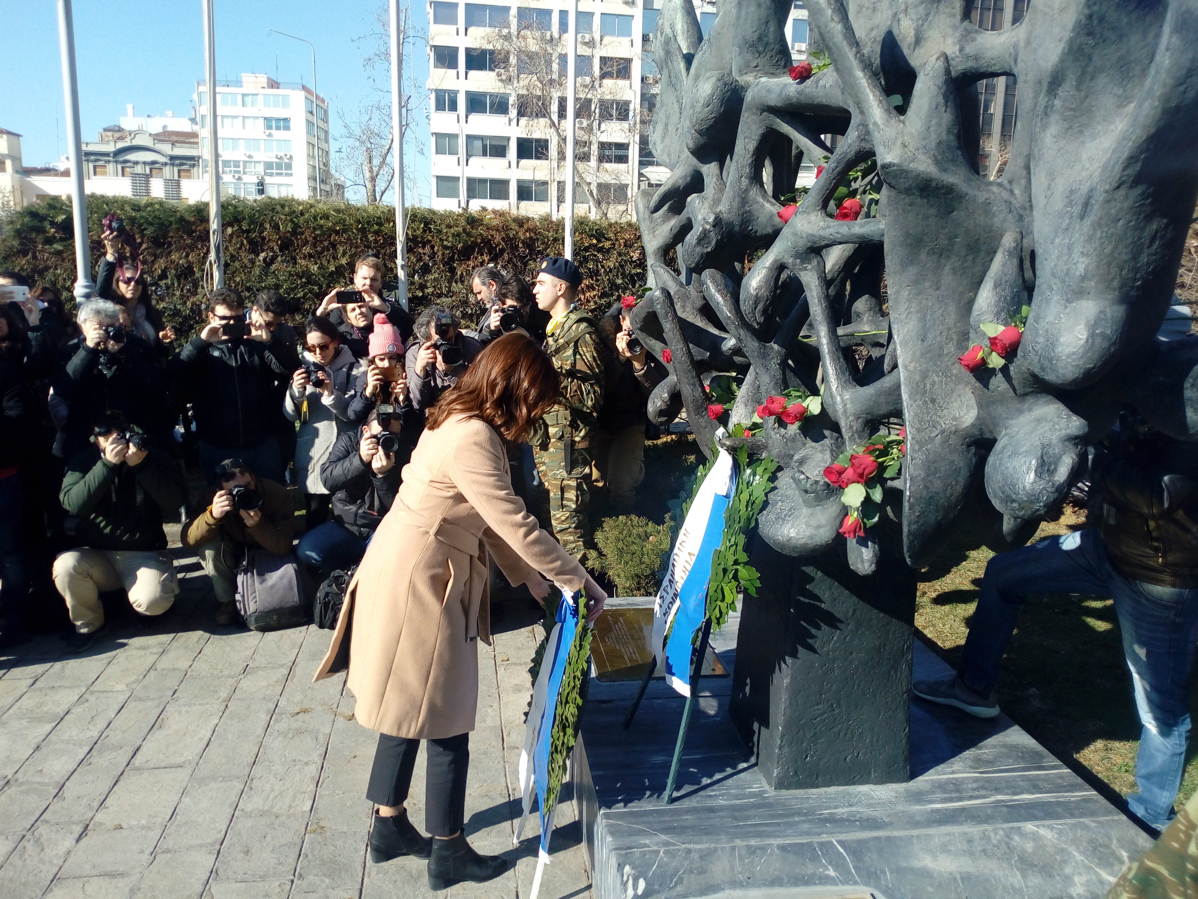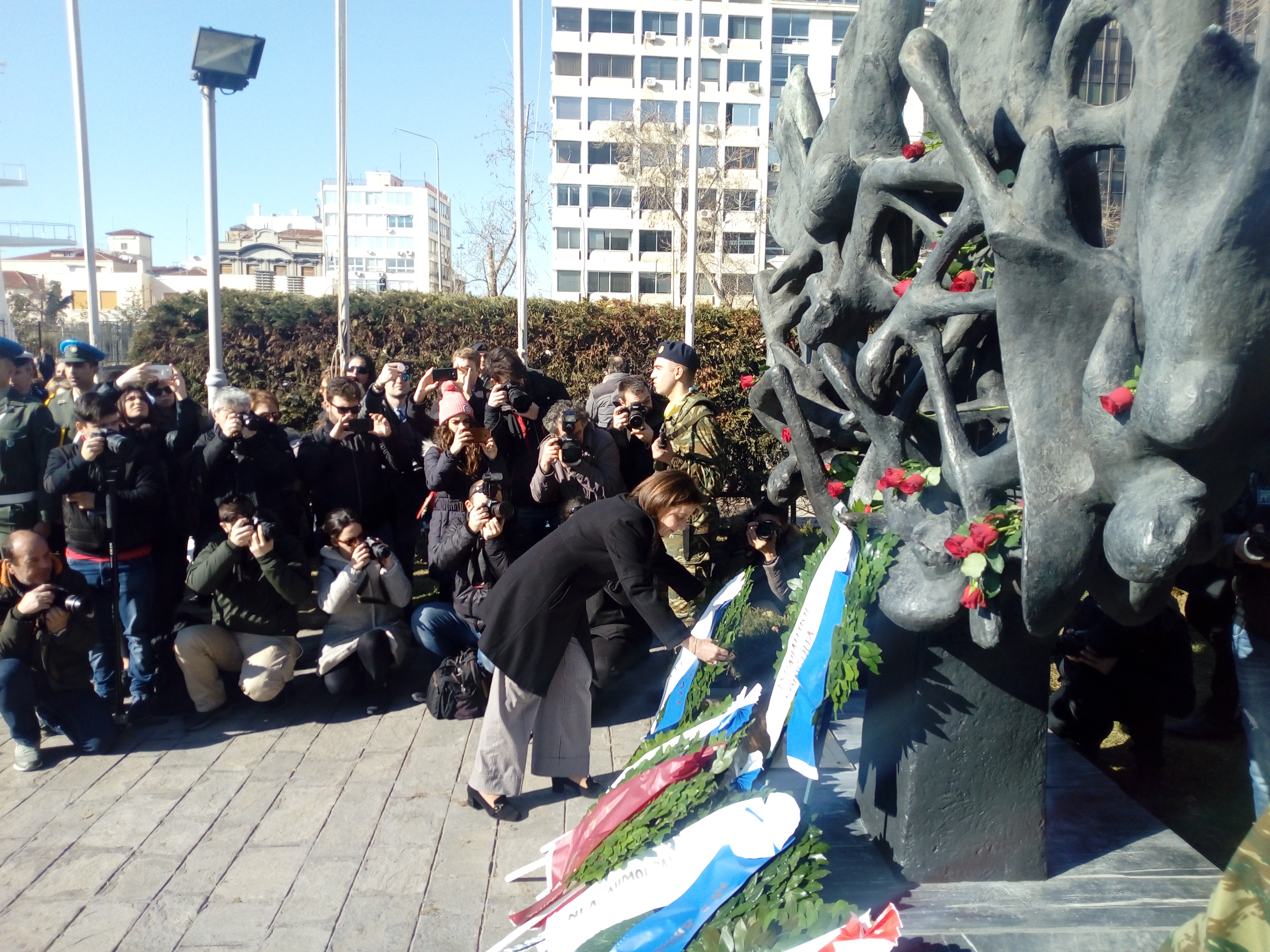 Ένα μνημείο που γέμισε από δεκάδες στεφάνια από εκπροσώπους της κυβέρνησης και των κομμάτων, των πολιτικών και των στρατιωτικών αρχών της πόλης, φορέων της Θεσσαλονίκης, αλλά και Εβραίων από ολόκληρη την Ελλάδα.