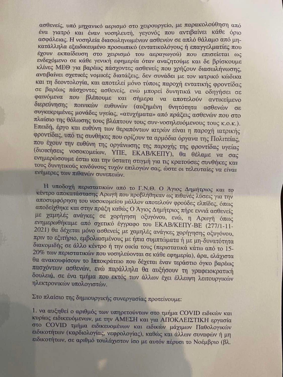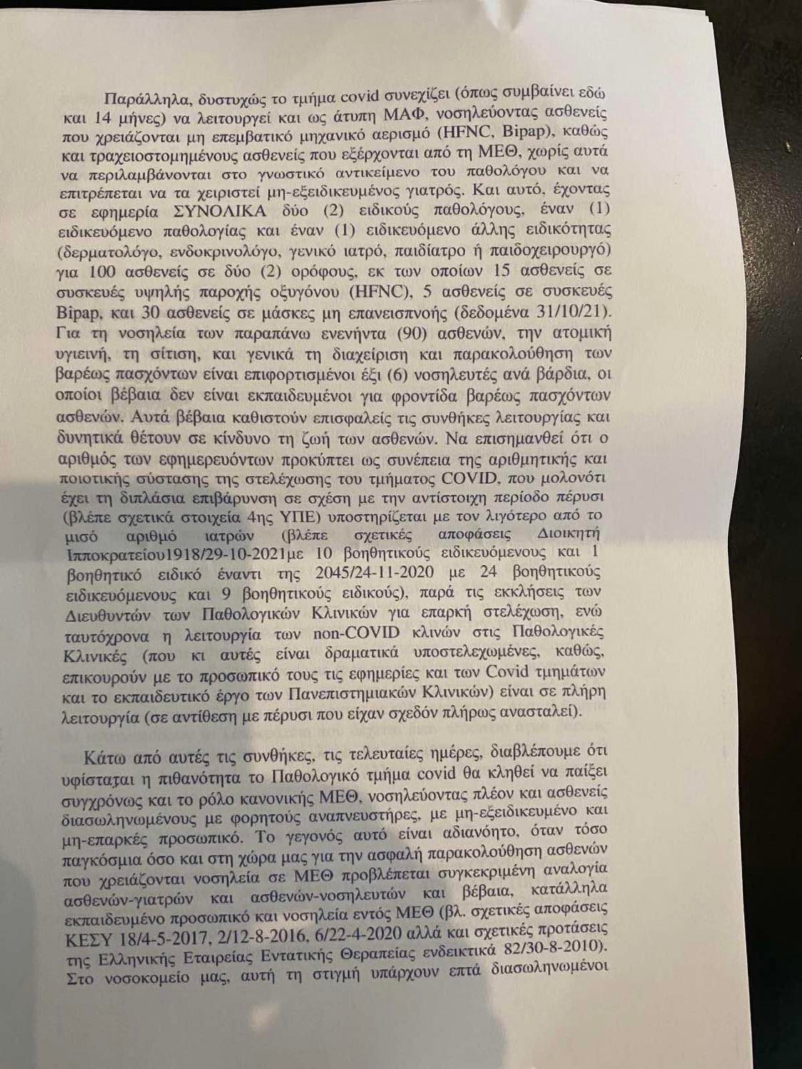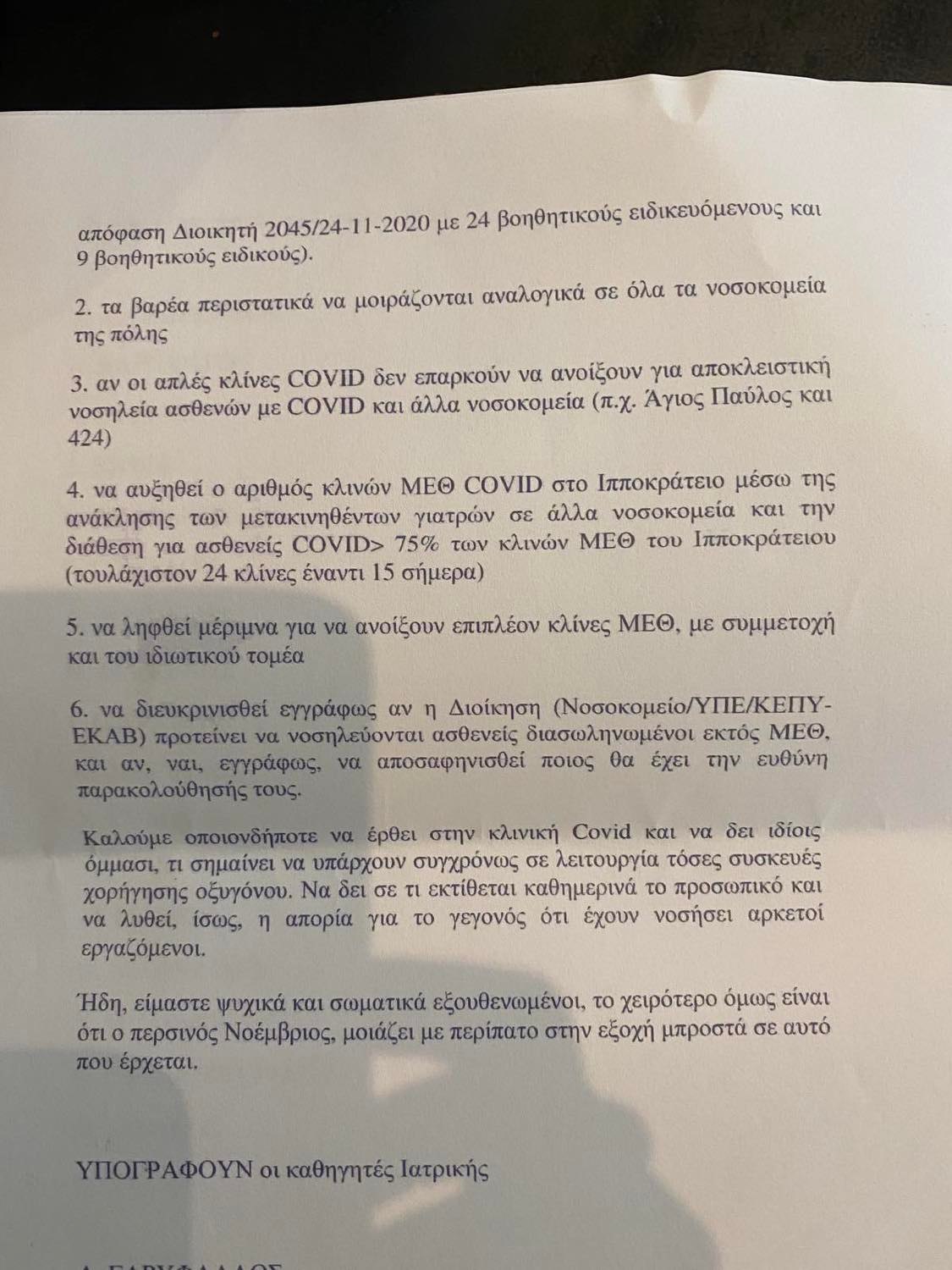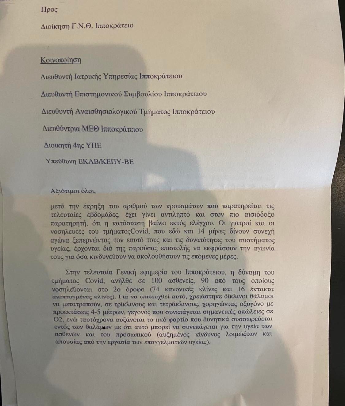 Την επιστολή συνυπογράφουν και πολλοί ειδικευόμενοι. Η επιστολή εστάλη στις 3 Νοεμβρίου. Οι γιατροί επισημαίνουν πως θα χρειαστεί να διασωληνωθούν ασθενείς ακόμα και σε απλές παθολογικές κλινικές στο Ιπποκράτειο.