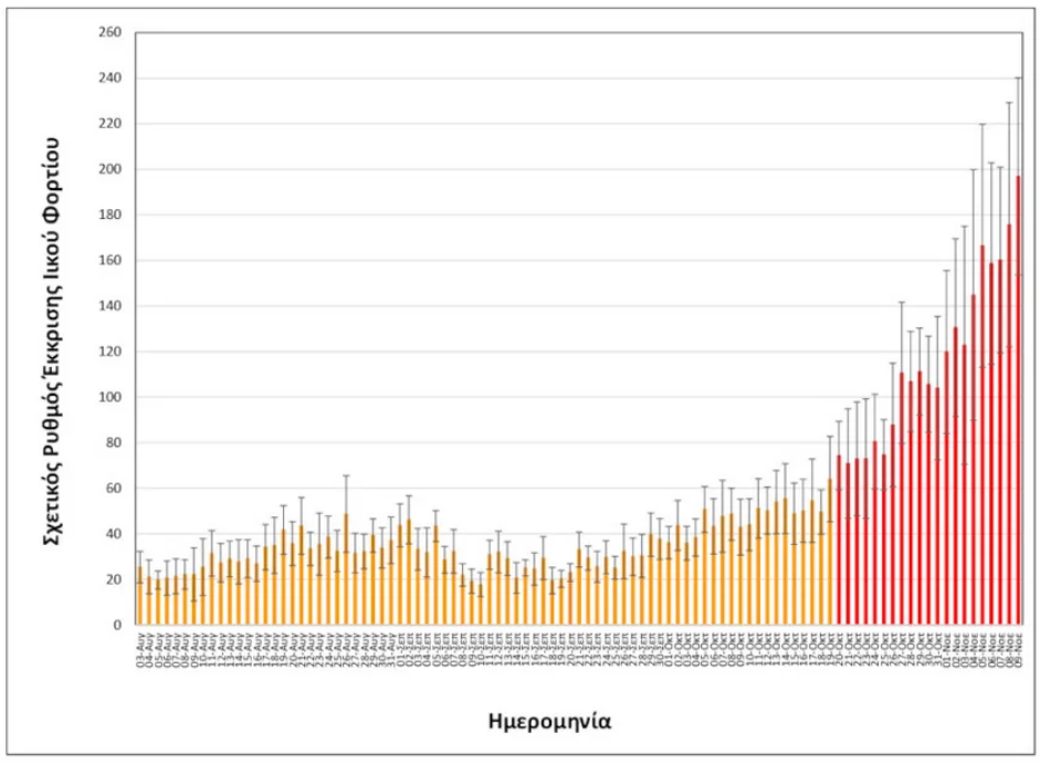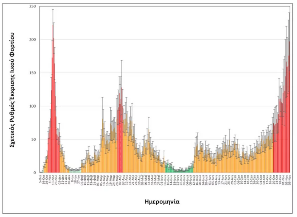 Όπως φαίνεται στα διαγράμματα που παρουσιάζει το ΑΠΕ-ΜΠΕ (επισυνάπτονται), οι τιμές του ιικού φορτίου προσεγγίζουν πλέον τις υψηλότερες τιμές του σφοδρού κύματος της πανδημίας του περσινού Νοέμβρη.