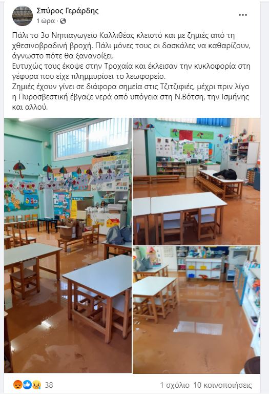 Δεν πήγαν το πρωί της Τετάρτης για μάθημα τα παιδιά του 3ου Νηπιαγωγείου στην Καλλιθέα καθώς ο χώρος τα ξημερώματα της ίδιας μέρας πλημμύρισε εξαιτίας της έντονης βροχόπτωσης που καταγράφηκε και το κτίριο φυσικά δεν μπορούσε να φιλοξενήσει παιδιά.