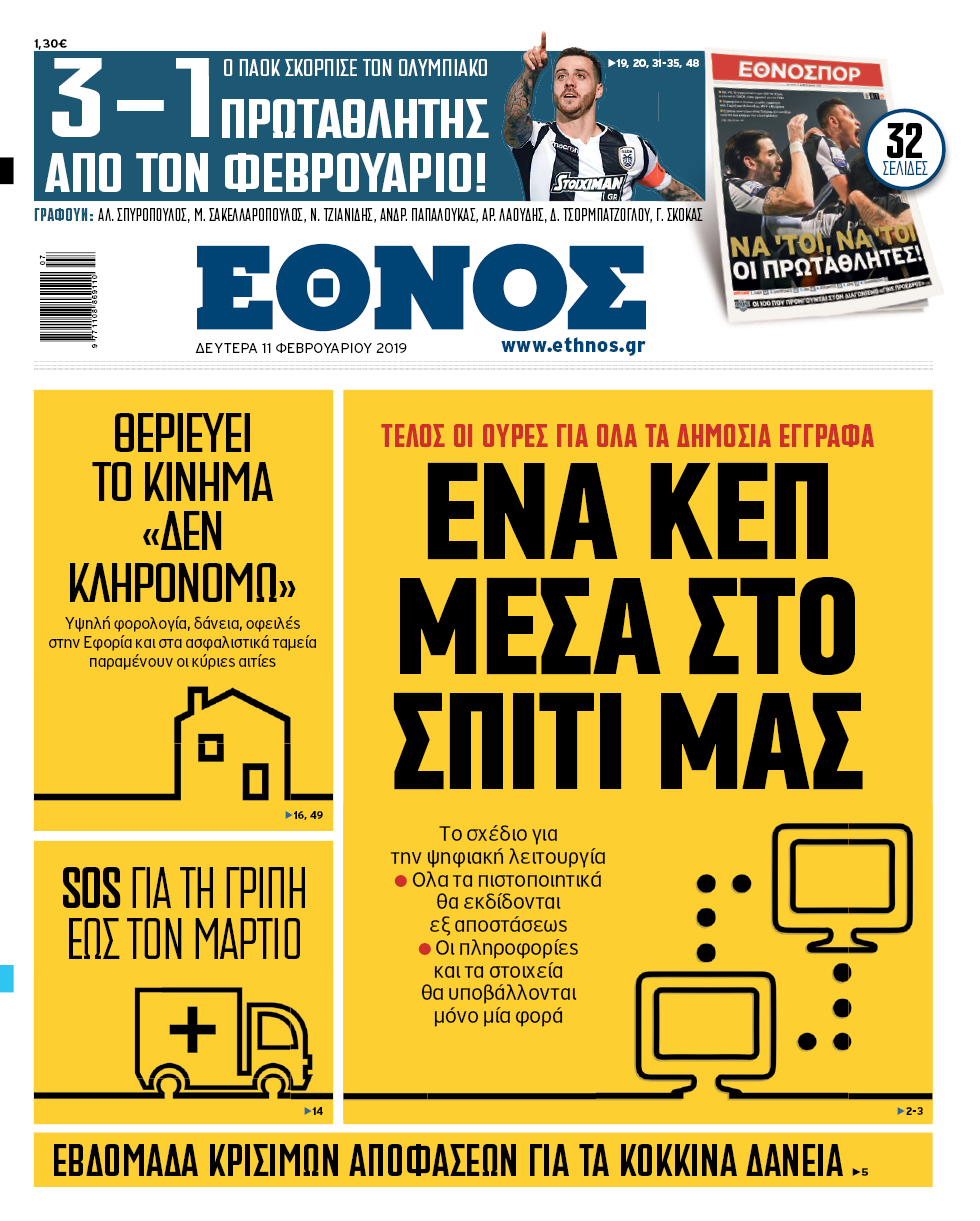 Διαβάστε στο ΕΘΝΟΣ που κυκλοφορεί τη Δευτέρα 11/2/2019