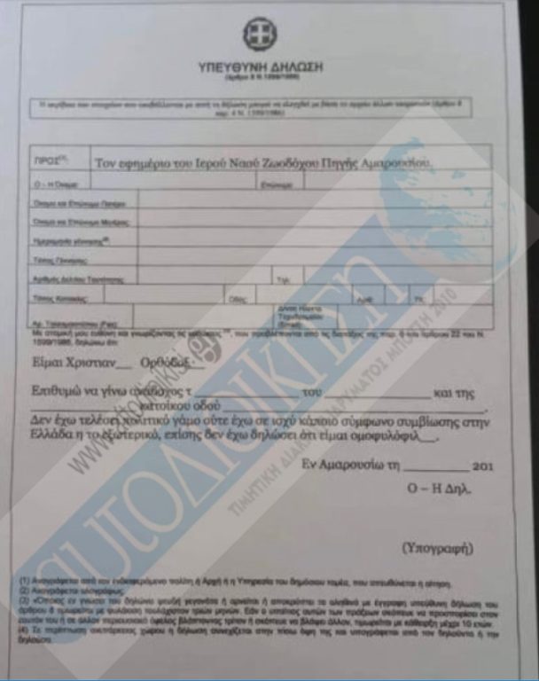 Νωρίτερα δημοσίευμα της ιστοσελίδας aftodioikisi.gr ανέφερε ότι μία εκκλησία στο Μαρούσι ζητεί από υποψήφιους νονούς να συμπληρώσουν υπεύθυνη δήλωση του ν. 1599/86, στην οποία υπάρχει «όρος» ότι «δεν έχουν τελέσει πολιτικό γάμο, ούτε έχουν σε ισχύ κάποιο σύμφωνο συμβίωσης στην Ελλάδα ή στο εξωτερικό, και ότι δεν είναι ομοφυλόφιλοι».